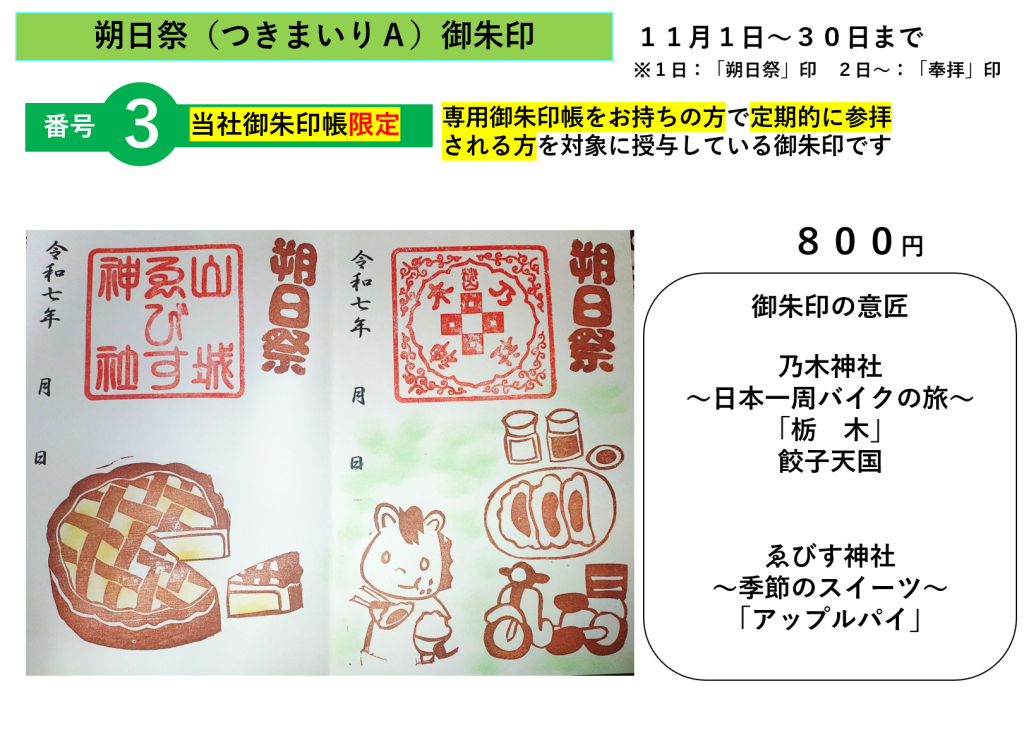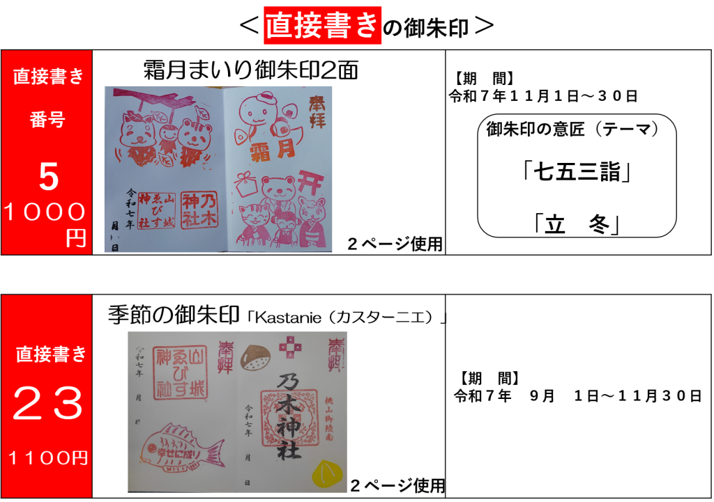 ・当社の御朱印は全て神職が手彫りした印を一体ずつ手押ししております。御朱印の意匠(デザイン)は、古来より我々が大切にしてきた行事や四季の移ろいを感じていただける様なものを選んでおります。